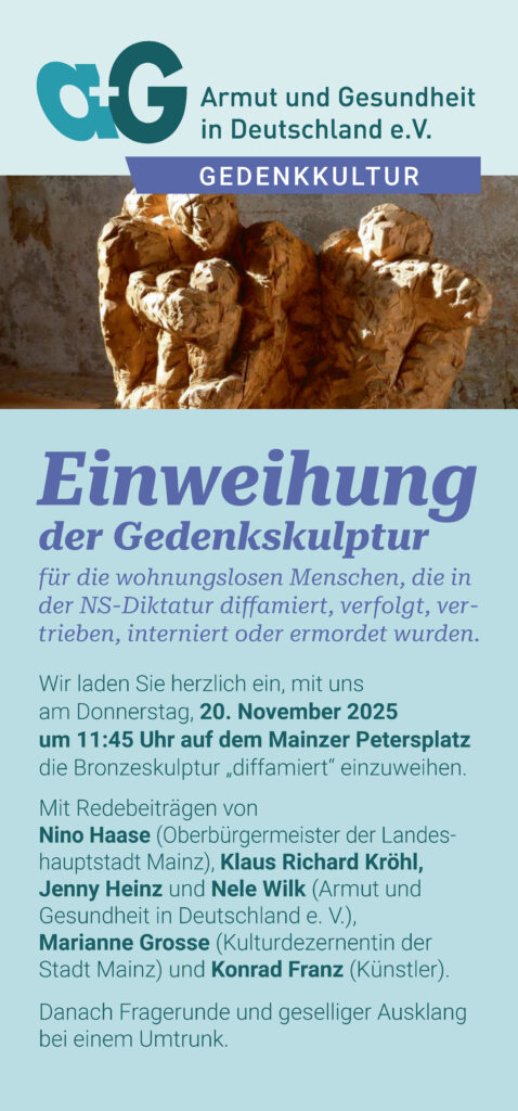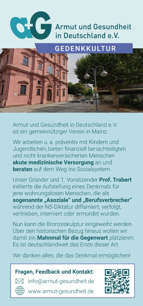 Prof. Dr. Trabert hat sich jahrelang dafür eingesetzt, dass ein Denkmal im öffentlichen Raum platziert wird, das an jene wohnungslosen Menschen erinnert, die als sogenannte „Asoziale“ und „Berufsverbrecher“ während der NS-Diktatur diffamiert, verfolgt, vertrieben, interniert oder ermordet wurden.