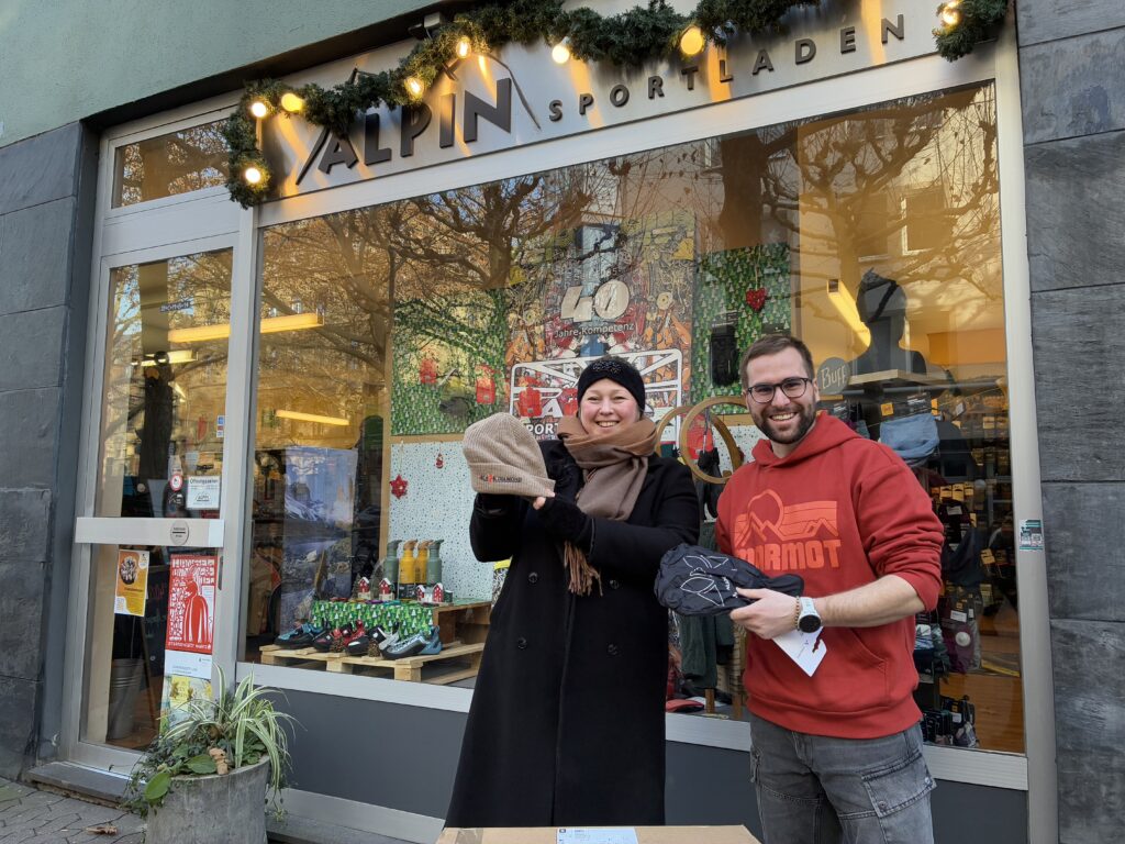 Auch in diesem Jahr möchten wir uns herzlich bedanken beim Alpin Sportladen Mainz: Dank toller Rabatte konnten wir wieder eine Vielzahl an Rucksäcken, Schlafsäcken und diesmal auch warmer Mützen bekommen, die wir an alle verteilen, die draußen in der Kälte dringend darauf angewiesen sind.