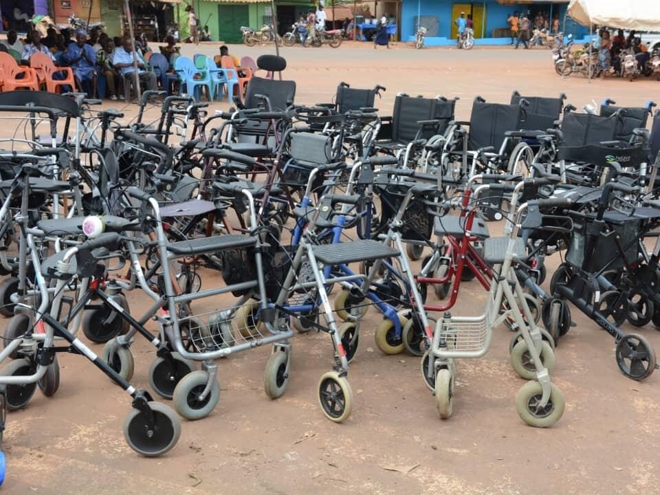 Die 45 Rollstühle (darunter einige für Kinder, mit Elektroantrieb oder Pflegerollstühle), 90 Rollatoren, ca. 130 Paar Krücken, einige Gehböcke und 10 Kisten voll mit Orthesen sind Ende des vergangenen Jahres bei unserem Partnerverein MUDESCAF e. V. in Afféry angekommen und wurden inzwischen in einer feierlichen Übergabezeremonie an Menschen mit Gehbehinderungen verteilt.