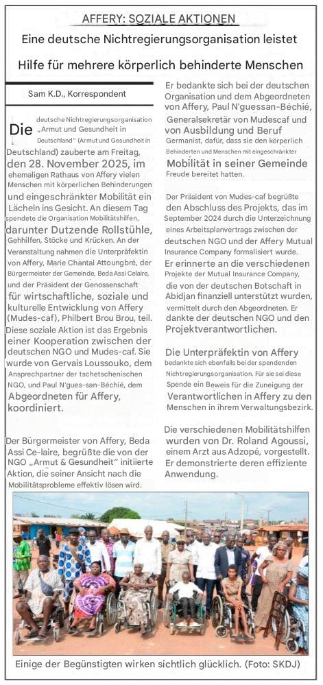 Gemeinsam mit MUDESCAF möchten wir uns von Herzen bei den Spender*innen bedanken. „Einige der Begünstigten waren sichtlich glücklich“, berichtete die Lokalzeitung in Afféry. Die Hilfsmittel bedeuten für sie erstmals wieder selbstständige Bewegung und damit ein Stück Würde im Alltag.
